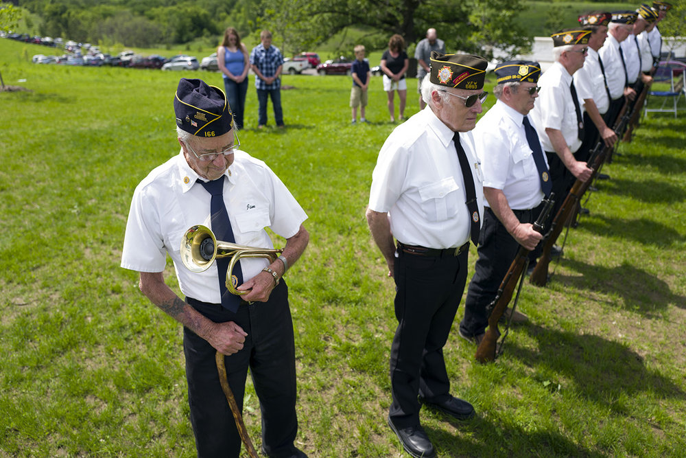 Army WWII veteran Jim Pickett bowed his head during a prayer before playing taps with members of the Preston Memorial Rifle Squad at the State Veterans Cemetery in Preston, Minn., on Sunday, May 29, 2016