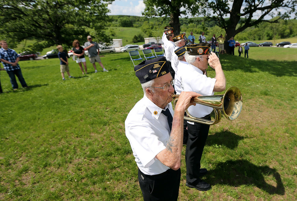 Jim Pickett, Army WWII veteran, played taps with members of the Preston Memorial Rifle Squad at the State Veterans Cemetery in Preston, Minn., on Sunday, May 29, 2016.