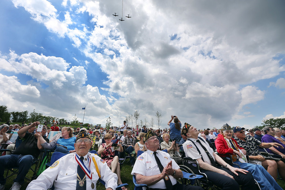 Minnesota veterans Norbert Skaran, left, WW II, Roger Tangen, Vietnam, Dale Wondrasch, Korea, and Malcolm Goodman, WW II, watched a flyover of WW II aircraft at the Minnesota State Veterans Cemetery Sunday, May 29, 2016, in Preston, MN.