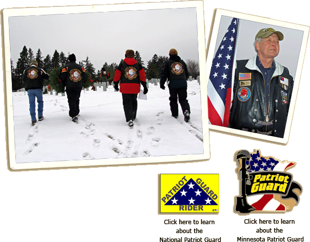 The Minnesota Patriot Guard Is a diverse group of people. Our motto is Honor, Dignity and Respect. The Patriot Guard Mission coincides with the Mission of WreathsForTheFallen.org by showing that soldiers sacrifices with never be forgotten. The Minnesota Patriot Guard has been instrumental in the National Remembrance Ceremony for many years. Patriot guard members’ come from many areas to honor our veterans and participate, from assisting with transporting wreaths to the cemetery to the actual placement on the veterans graves. Each year the ceremony is a sanctioned “Mission” of the Patriot Guard and is attended by many members. To become a member of the Patriot Guard we suggest you go to the national site and register and then go to the Minnesota site and register also.